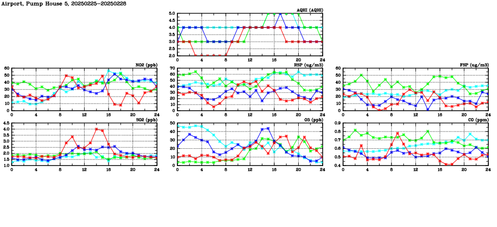 | Air Quality Data Time Series in Airport, Pump House 5 (2025/02/28) | ( Line colors: Day -3 Day -2 Day -1 Current day ) | 2D Map Current AQHI |