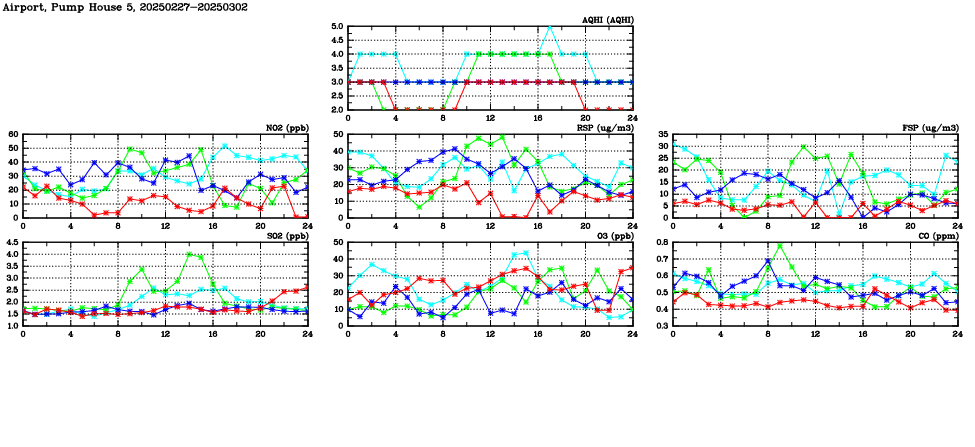 | Air Quality Data Time Series in Airport, Pump House 5 (2025/03/02) | ( Line colors: Day -3 Day -2 Day -1 Current day ) | 2D Map Current AQHI |