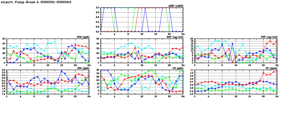 | Air Quality Data Time Series in Airport, Pump House 5 (2025/03/04) | ( Line colors: Day -3 Day -2 Day -1 Current day ) | 2D Map Current AQHI |