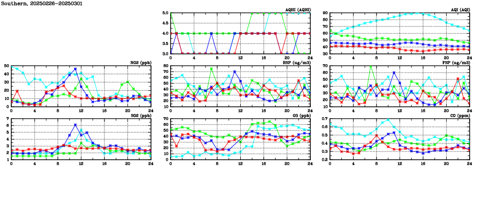 | Air Quality Data Time Series in Southern (2025/03/01) | ( Line colors: Day -3 Day -2 Day -1 Current day ) | 2D Map Current AQHI |