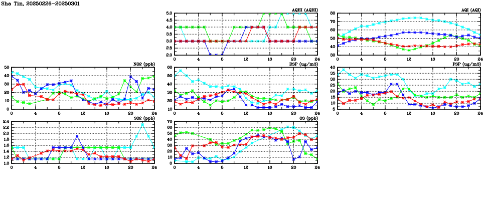 | Air Quality Data Time Series in Sha Tin (2025/03/01) | ( Line colors: Day -3 Day -2 Day -1 Current day ) | 2D Map Current AQHI |