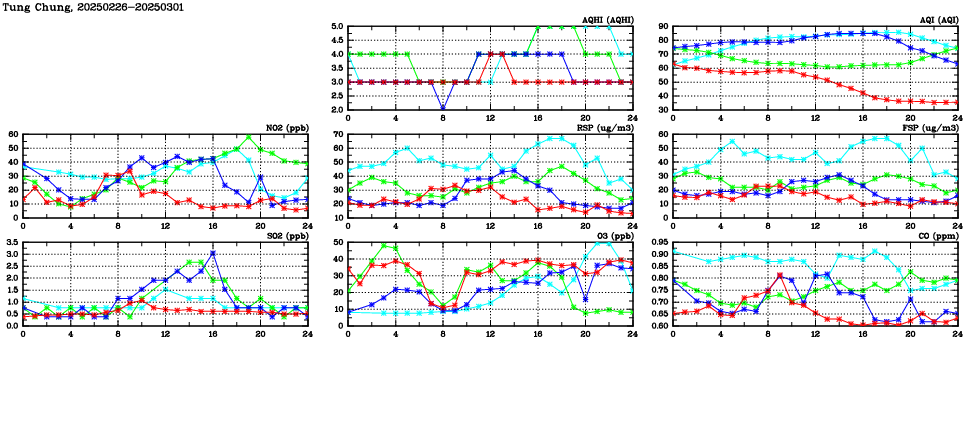 | Air Quality Data Time Series in Tung Chung (2025/03/01) | ( Line colors: Day -3 Day -2 Day -1 Current day ) | 2D Map Current AQHI |