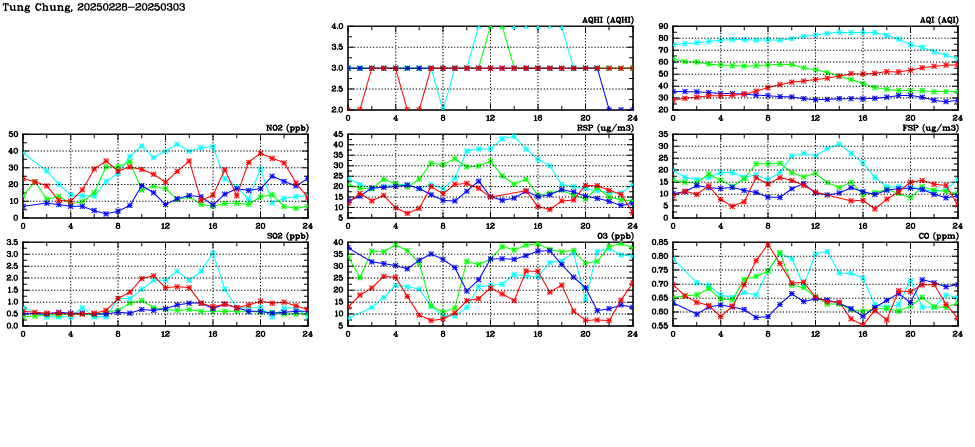 | Air Quality Data Time Series in Tung Chung (2025/03/03) | ( Line colors: Day -3 Day -2 Day -1 Current day ) | 2D Map Current AQHI |