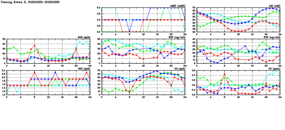 | Air Quality Data Time Series in Tseung Kwan O (2025/02/28) | ( Line colors: Day -3 Day -2 Day -1 Current day ) | 2D Map Current AQHI |