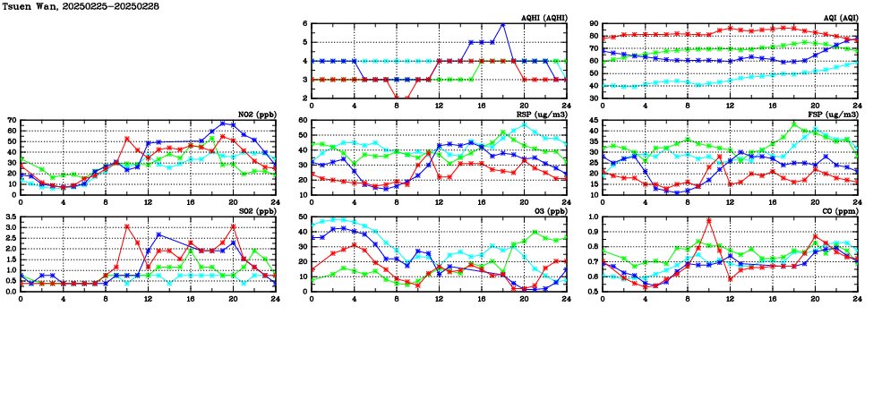 | Air Quality Data Time Series in Tsuen Wan (2025/02/28) | ( Line colors: Day -3 Day -2 Day -1 Current day ) | 2D Map Current AQHI |