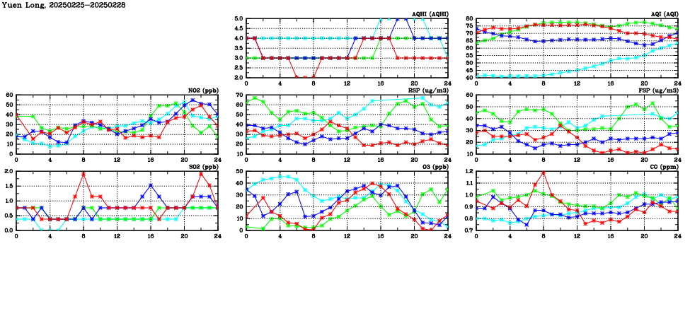 | Air Quality Data Time Series in Yuen Long (2025/02/28) | ( Line colors: Day -3 Day -2 Day -1 Current day ) | 2D Map Current AQHI |