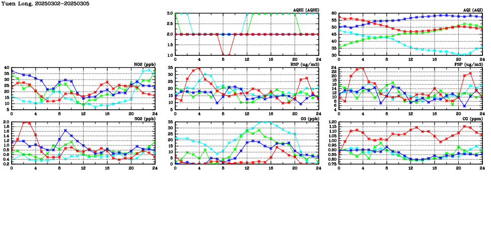 | Air Quality Data Time Series in Yuen Long (2025/03/05) | ( Line colors: Day -3 Day -2 Day -1 Current day ) | 2D Map Current AQHI |