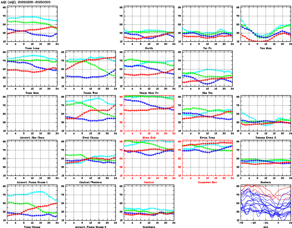| Air Quality Data Time Series for AQI (2025/03/03) | ( Line colors: Day -3 Day -2 Day -1 Current day ) | 2D Map Current AQHI |