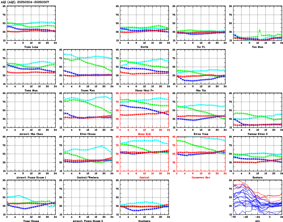 | Air Quality Data Time Series for AQI (2025/03/07) | ( Line colors: Day -3 Day -2 Day -1 Current day ) | 2D Map Current AQHI |