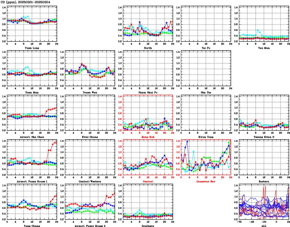 | Air Quality Data Time Series for CO (2025/03/04) | ( Line colors: Day -3 Day -2 Day -1 Current day ) | 2D Map Current AQHI |
