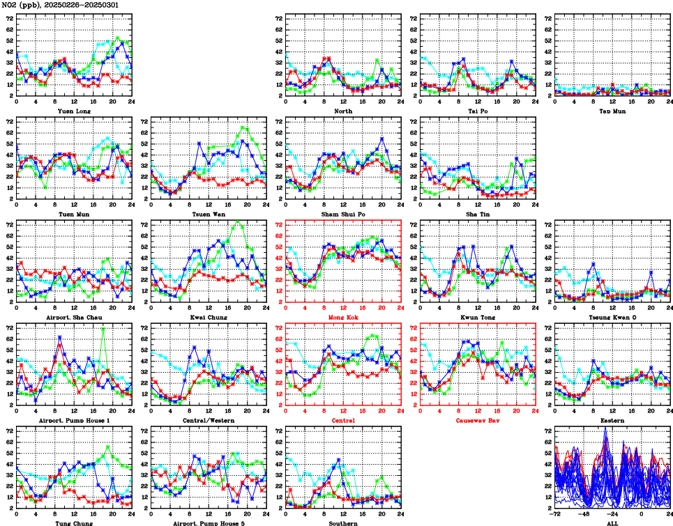 | Air Quality Data Time Series for NO2 (2025/03/01) | ( Line colors: Day -3 Day -2 Day -1 Current day ) | 2D Map Current AQHI |