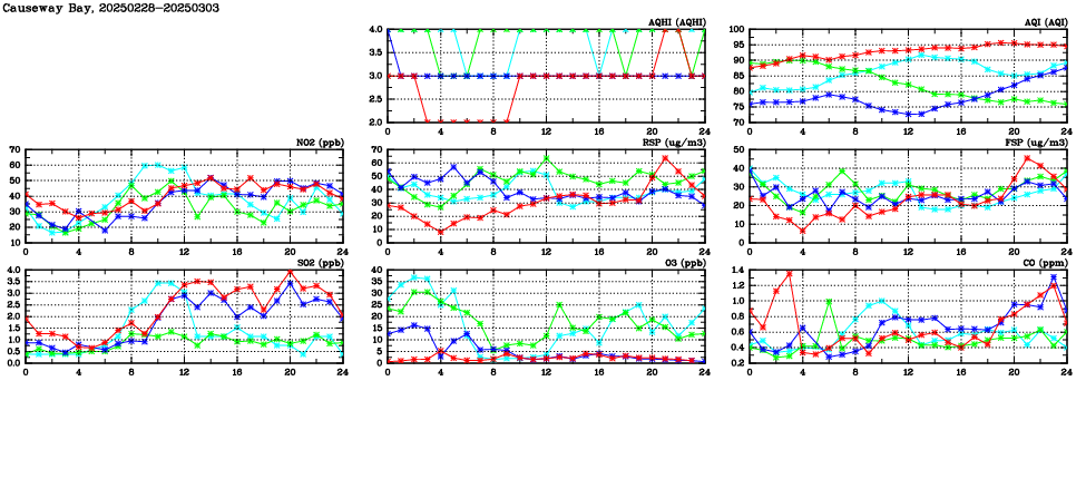 | Air Quality Data Time Series in Causeway Bay (2025/03/03) | ( Line colors: Day -3 Day -2 Day -1 Current day ) | 2D Map Current AQHI |