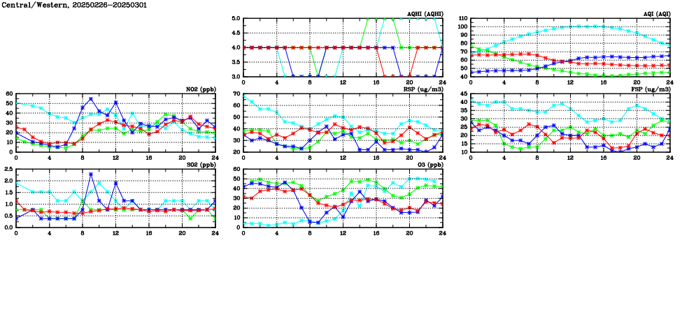 | Air Quality Data Time Series in Central/Western (2025/03/01) | ( Line colors: Day -3 Day -2 Day -1 Current day ) | 2D Map Current AQHI |