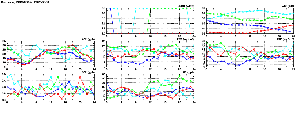 | Air Quality Data Time Series in Eastern (2025/03/07) | ( Line colors: Day -3 Day -2 Day -1 Current day ) | 2D Map Current AQHI |