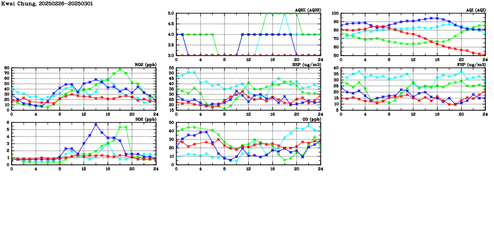 | Air Quality Data Time Series in Kwai Chung (2025/03/01) | ( Line colors: Day -3 Day -2 Day -1 Current day ) | 2D Map Current AQHI |