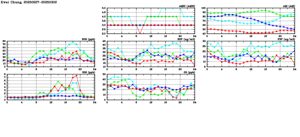 | Air Quality Data Time Series in Kwai Chung (2025/03/02) | ( Line colors: Day -3 Day -2 Day -1 Current day ) | 2D Map Current AQHI |