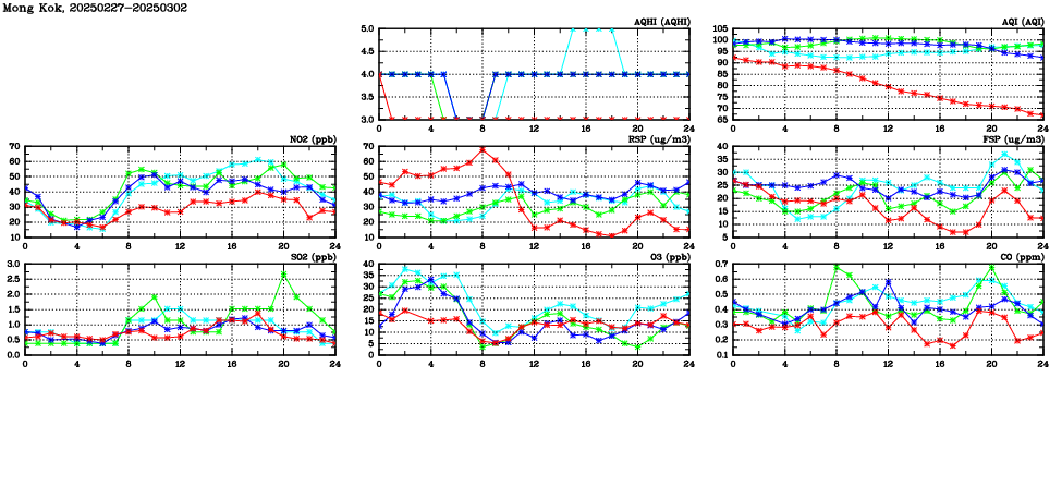 | Air Quality Data Time Series in Mong Kok (2025/03/02) | ( Line colors: Day -3 Day -2 Day -1 Current day ) | 2D Map Current AQHI |