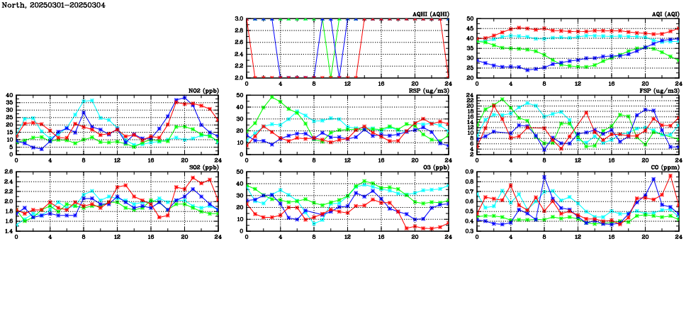 | Air Quality Data Time Series in North (2025/03/04) | ( Line colors: Day -3 Day -2 Day -1 Current day ) | 2D Map Current AQHI |