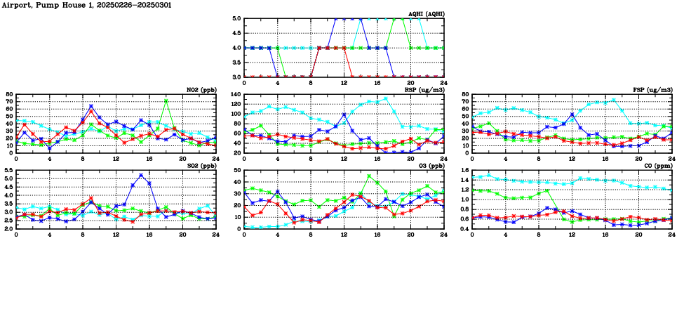 | Air Quality Data Time Series in Airport, Pump House 1 (2025/03/01) | ( Line colors: Day -3 Day -2 Day -1 Current day ) | 2D Map Current AQHI |