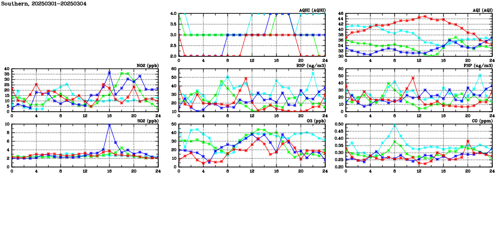 | Air Quality Data Time Series in Southern (2025/03/04) | ( Line colors: Day -3 Day -2 Day -1 Current day ) | 2D Map Current AQHI |