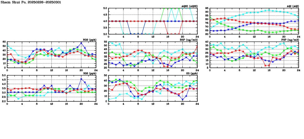 | Air Quality Data Time Series in Sham Shui Po (2025/03/01) | ( Line colors: Day -3 Day -2 Day -1 Current day ) | 2D Map Current AQHI |