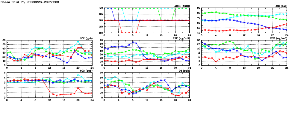 | Air Quality Data Time Series in Sham Shui Po (2025/03/03) | ( Line colors: Day -3 Day -2 Day -1 Current day ) | 2D Map Current AQHI |