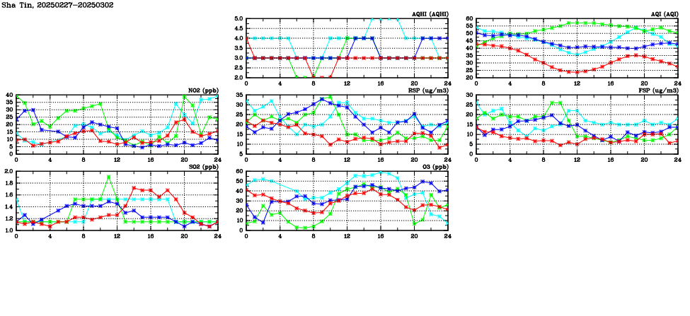 | Air Quality Data Time Series in Sha Tin (2025/03/02) | ( Line colors: Day -3 Day -2 Day -1 Current day ) | 2D Map Current AQHI |