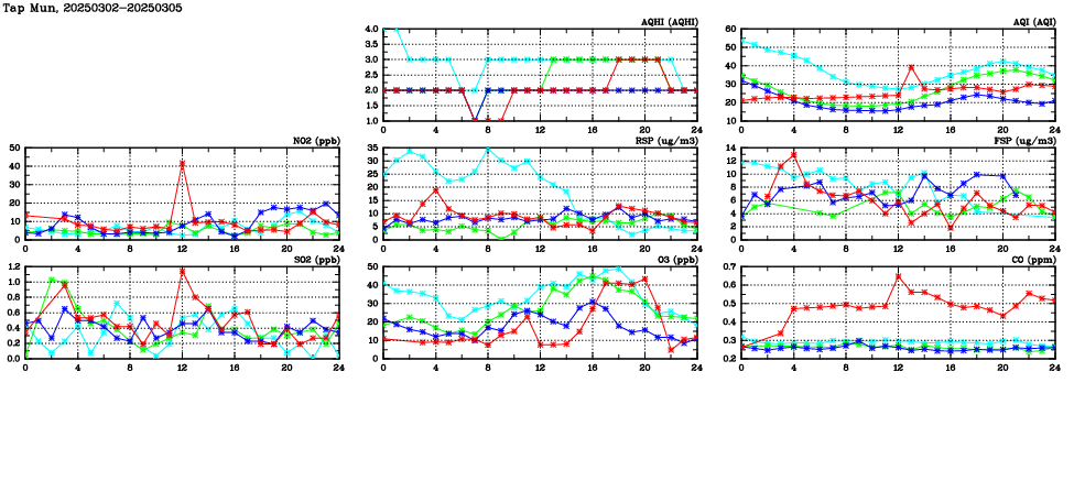 | Air Quality Data Time Series in Tap Mun (2025/03/05) | ( Line colors: Day -3 Day -2 Day -1 Current day ) | 2D Map Current AQHI |