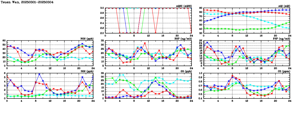 | Air Quality Data Time Series in Tsuen Wan (2025/03/04) | ( Line colors: Day -3 Day -2 Day -1 Current day ) | 2D Map Current AQHI |