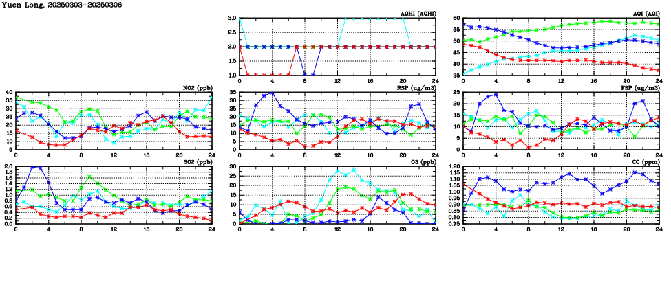 | Air Quality Data Time Series in Yuen Long (2025/03/06) | ( Line colors: Day -3 Day -2 Day -1 Current day ) | 2D Map Current AQHI |