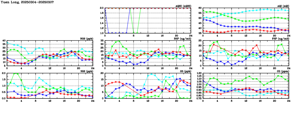 | Air Quality Data Time Series in Yuen Long (2025/03/07) | ( Line colors: Day -3 Day -2 Day -1 Current day ) | 2D Map Current AQHI |
