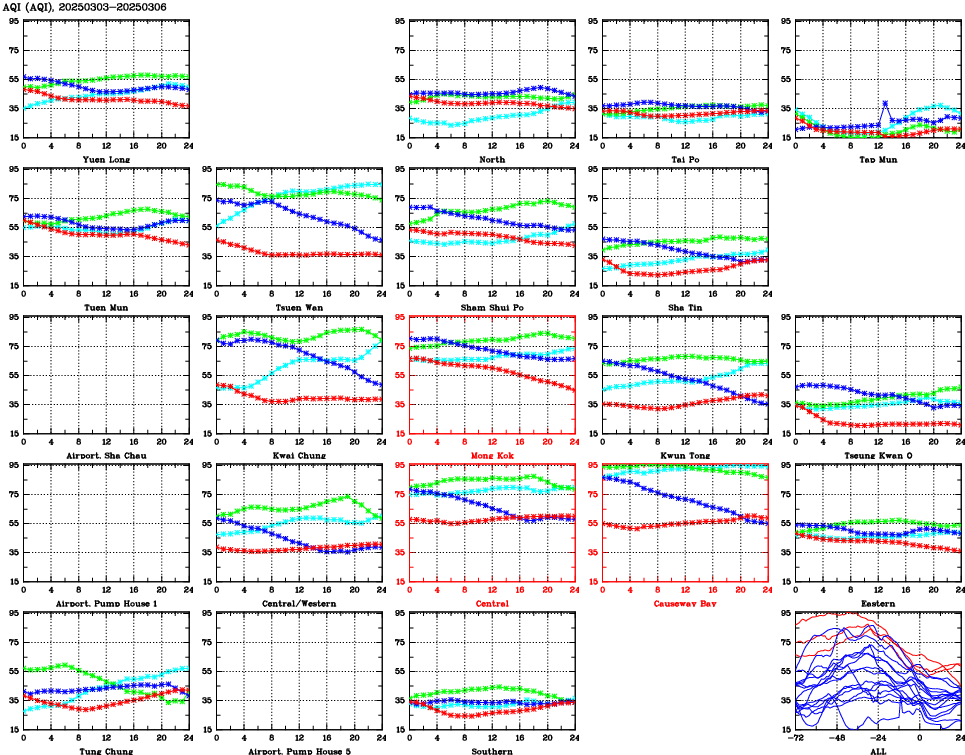 | Air Quality Data Time Series for AQI (2025/03/06) | ( Line colors: Day -3 Day -2 Day -1 Current day ) | 2D Map Current AQHI |