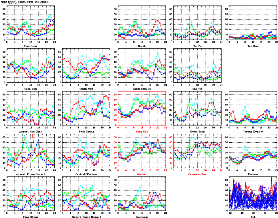 | Air Quality Data Time Series for NO2 (2025/03/03) | ( Line colors: Day -3 Day -2 Day -1 Current day ) | 2D Map Current AQHI |