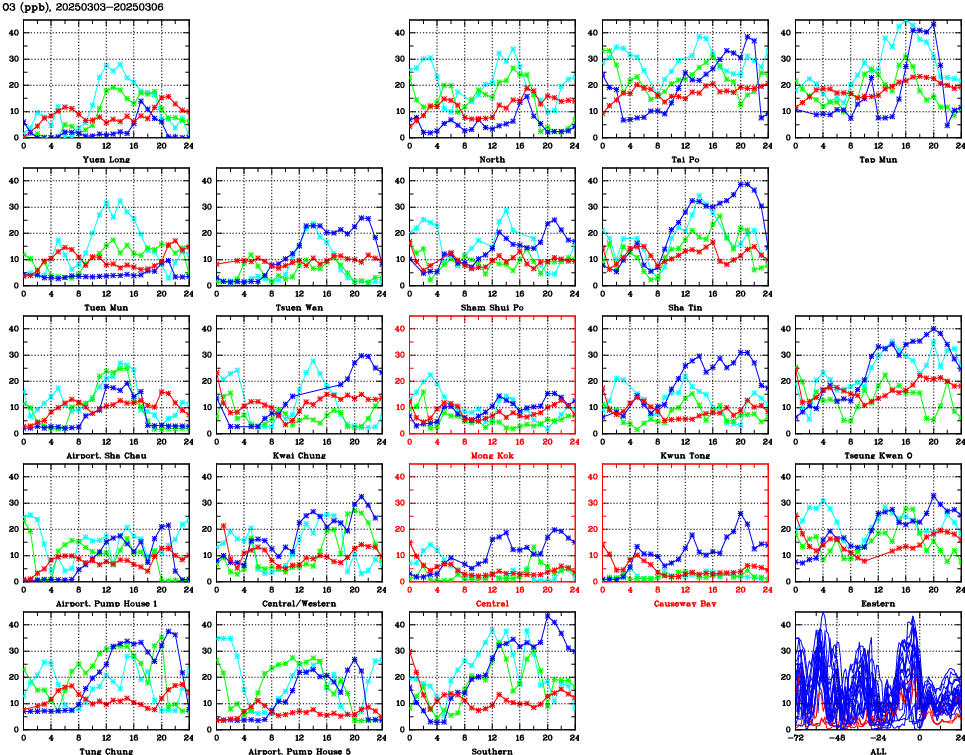 | Air Quality Data Time Series for O3 (2025/03/06) | ( Line colors: Day -3 Day -2 Day -1 Current day ) | 2D Map Current AQHI |