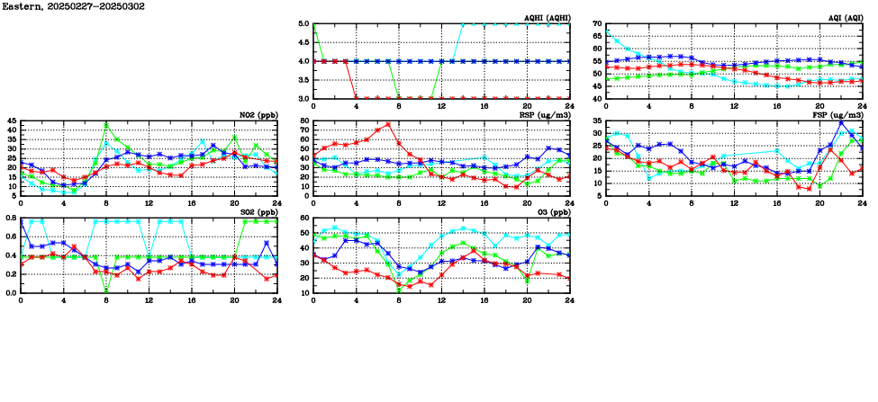 | Air Quality Data Time Series in Eastern (2025/03/02) | ( Line colors: Day -3 Day -2 Day -1 Current day ) | 2D Map Current AQHI |