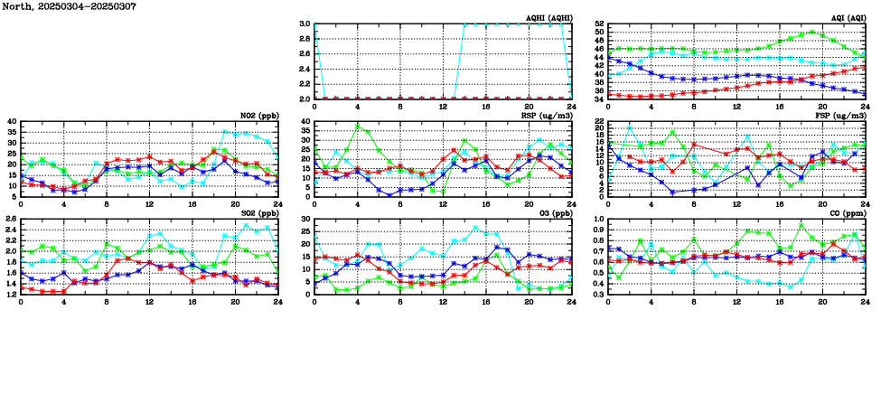 | Air Quality Data Time Series in North (2025/03/07) | ( Line colors: Day -3 Day -2 Day -1 Current day ) | 2D Map Current AQHI |