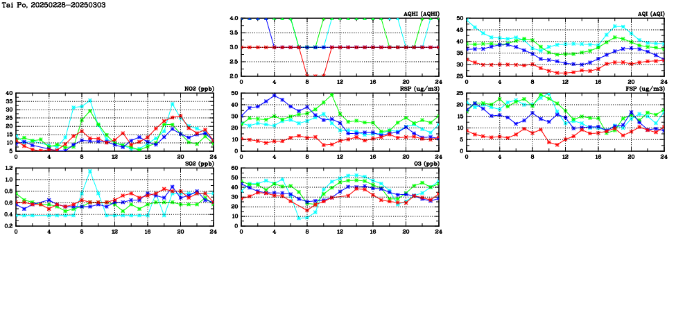 | Air Quality Data Time Series in Tai Po (2025/03/03) | ( Line colors: Day -3 Day -2 Day -1 Current day ) | 2D Map Current AQHI |