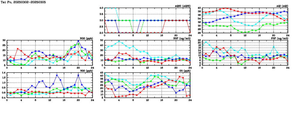 | Air Quality Data Time Series in Tai Po (2025/03/05) | ( Line colors: Day -3 Day -2 Day -1 Current day ) | 2D Map Current AQHI |