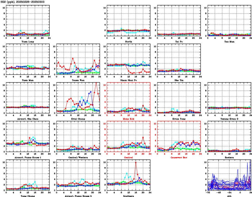 | Air Quality Data Time Series for SO2 (2025/03/03) | ( Line colors: Day -3 Day -2 Day -1 Current day ) | 2D Map Current AQHI |