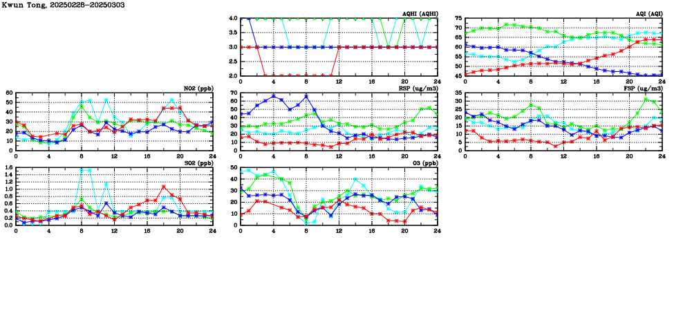 | Air Quality Data Time Series in Kwun Tong (2025/03/03) | ( Line colors: Day -3 Day -2 Day -1 Current day ) | 2D Map Current AQHI |