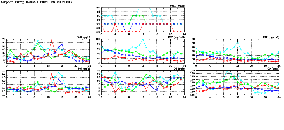 | Air Quality Data Time Series in Airport, Pump House 1 (2025/03/03) | ( Line colors: Day -3 Day -2 Day -1 Current day ) | 2D Map Current AQHI |