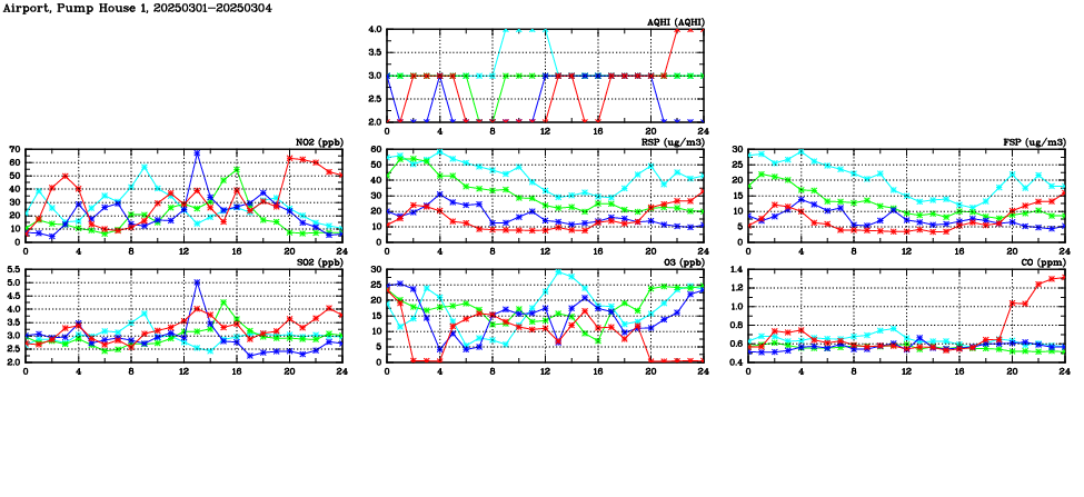| Air Quality Data Time Series in Airport, Pump House 1 (2025/03/04) | ( Line colors: Day -3 Day -2 Day -1 Current day ) | 2D Map Current AQHI |