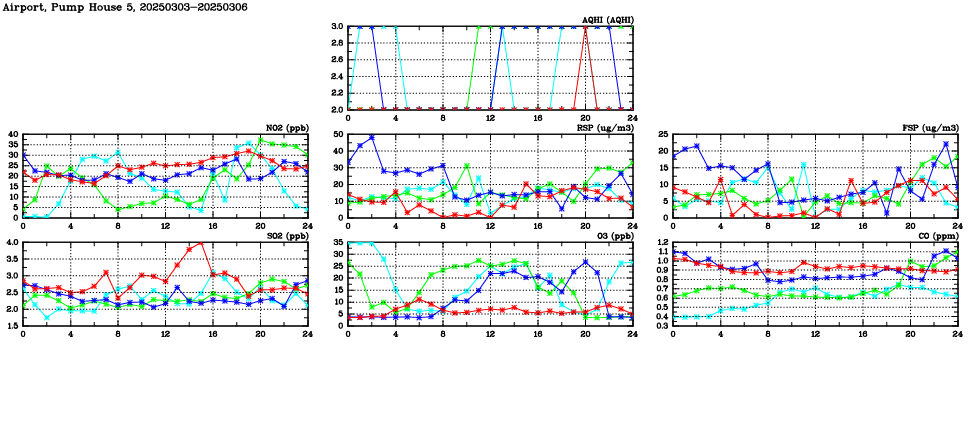 | Air Quality Data Time Series in Airport, Pump House 5 (2025/03/06) | ( Line colors: Day -3 Day -2 Day -1 Current day ) | 2D Map Current AQHI |