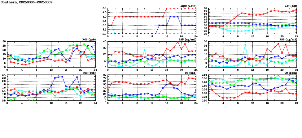 | Air Quality Data Time Series in Southern (2025/03/09) | ( Line colors: Day -3 Day -2 Day -1 Current day ) | 2D Map Current AQHI |