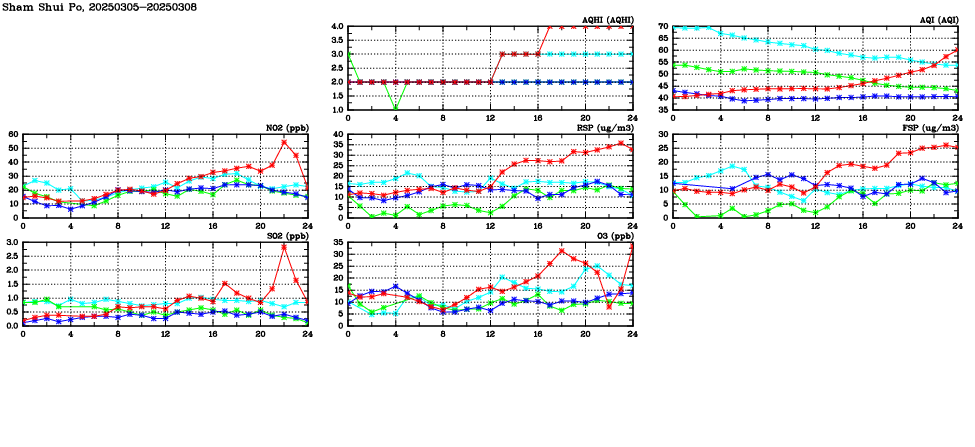 | Air Quality Data Time Series in Sham Shui Po (2025/03/08) | ( Line colors: Day -3 Day -2 Day -1 Current day ) | 2D Map Current AQHI |