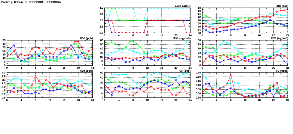 | Air Quality Data Time Series in Tseung Kwan O (2025/03/04) | ( Line colors: Day -3 Day -2 Day -1 Current day ) | 2D Map Current AQHI |