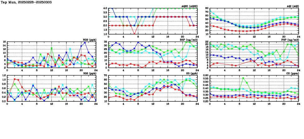 | Air Quality Data Time Series in Tap Mun (2025/03/03) | ( Line colors: Day -3 Day -2 Day -1 Current day ) | 2D Map Current AQHI |