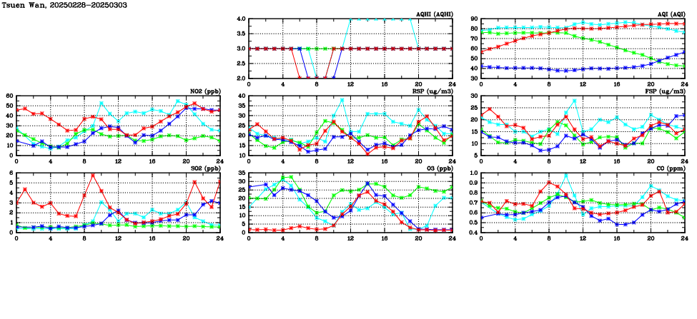 | Air Quality Data Time Series in Tsuen Wan (2025/03/03) | ( Line colors: Day -3 Day -2 Day -1 Current day ) | 2D Map Current AQHI |