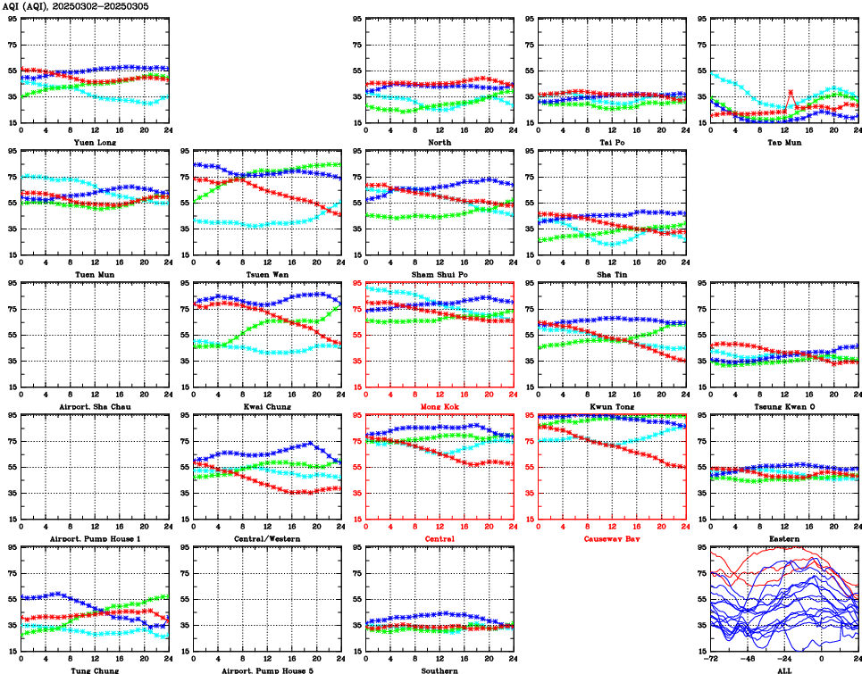| Air Quality Data Time Series for AQI (2025/03/05) | ( Line colors: Day -3 Day -2 Day -1 Current day ) | 2D Map Current AQHI |