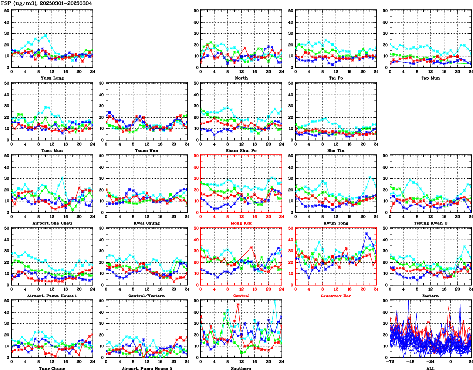 | Air Quality Data Time Series for FSP (2025/03/04) | ( Line colors: Day -3 Day -2 Day -1 Current day ) | 2D Map Current AQHI |